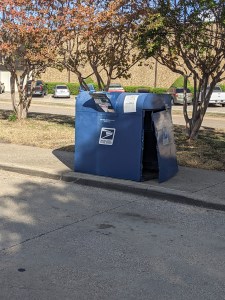 Several days ago I read an article from the post office. They recommended you not mail anything in a dropbox because they were deing broking into. TThis is no joke as our President is fond of saying. The picture is at my local post office. If you are mailing anything, take it inside the post office and give it to one of the postal workers or use the lobby dropbox.