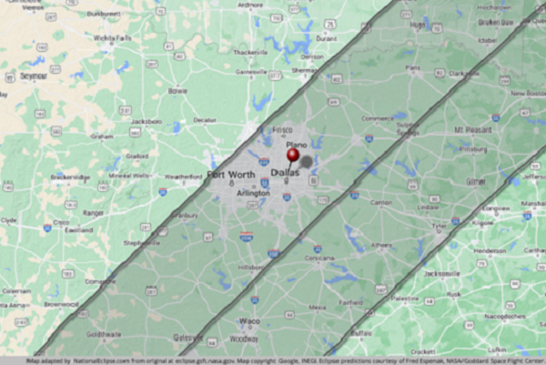 The entire sprawling Dallas-Fort Worth area spreads out from the western limit of the eclipse path all the way to the centerline, offering residents and visitors plenty of places to view totality.