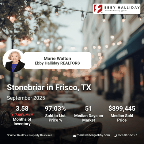 Navigating the Stonebriar real estate market can be complex, but you don’t have to do it alone. Whether you’re just starting your homebuying journey or looking to upgrade, Marie Walton of Ebby Halliday REALTORS is here to provide expert guidance tailored to your needs. Reach out to Marie at mariewalton@ebby.com to explore the opportunities that await you in Stonebriar.