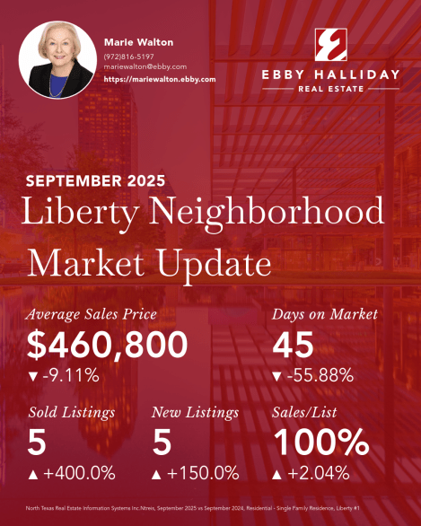 The single-family home sales market in the Liberty neighborhood of Melissa, Texas, remained active and competitive through September 2025. Buyers continue to be drawn to Liberty’s family-friendly atmosphere, top-rated schools, and convenient access to Highway 75—making it one of the most sought-after communities in the area. Homes that are well-maintained and priced right are still moving quickly, with motivated buyers eager to secure a spot in this charming neighborhood. Whether you’re looking to sell your home for top dollar or find your next dream property, **Marie Walton, Realtor**, brings the expertise, local knowledge, and negotiation skills needed to guide you through every step of the process with confidence and success.