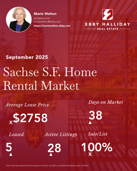 In September 2025, the single-family rental market in Sachse, Texas, reflected a balanced yet competitive atmosphere, with demand remaining steady among families and professionals seeking a suburban lifestyle close to major employment hubs. The city’s reputation for top-rated schools, well-kept neighborhoods, and easy access to both Dallas and Garland continues to draw renters who value convenience and community charm. Many rental homes showcase modern upgrades and open floor plans, appealing to those desiring both comfort and functionality. Navigating this market successfully requires the expertise of **Marie Walton, Realtor**, who understands local trends, negotiates strategically, and ensures you find the ideal home that fits both your lifestyle and budget. Her professionalism and local insight simplify the process, protecting your interests from start to finish.