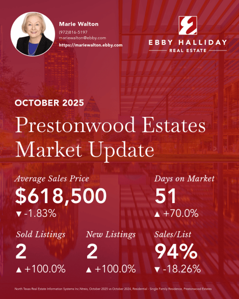 In September 2025, the single-family home market in Prestonwood continued to reflect the neighborhood’s enduring desirability and well-balanced pace between buyers and sellers. The area’s established charm, tree-lined streets, and proximity to top-rated schools have kept demand strong, even as buyers have become more strategic in their search for long-term value. Sellers in Prestonwood are benefiting from a stable pool of well-qualified buyers who recognize the value of quality homes in this classic North Dallas enclave. For buyers, opportunities still exist to secure a home in a mature neighborhood with lasting appeal and strong community roots—especially with the right guidance through negotiations and property evaluations. That’s where having **Marie Walton, Realtor** by your side makes all the difference. Marie’s deep local knowledge, sharp market insight, and dedication to client success ensure a smooth experience whether you’re buying or selling in Prestonwood Estates.