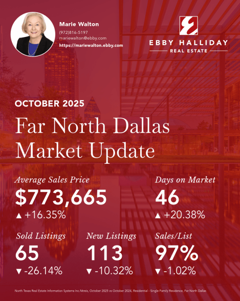 In October 2025, the single-family housing market in North and Far North Dallas reflected a tone of steady confidence and ongoing buyer engagement. Well-established neighborhoods continued to attract attention for their mature landscapes, access to top-tier schools, and proximity to major employment corridors. Meanwhile, newer communities on the outer edges of Far North Dallas remained appealing to those seeking more space and contemporary design features. Sellers benefited from consistent demand, while buyers navigated a competitive yet measured market that favored well-presented, move-in-ready homes. The tone of the market showed balance—neither overly aggressive nor stagnant—suggesting continued stability as the area moves toward the end of the year.