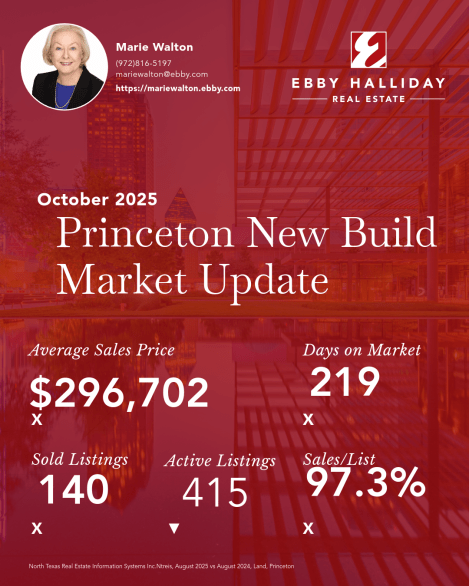 Single-family new construction sales in Princeton, TX during October 2025 continued to reflect the city’s steady momentum as one of Collin County’s most approachable and fast-growing markets. Buyers are finding that builders here are focusing on value, livability, and modern features rather than flashy upgrades, which makes Princeton especially appealing if you’re looking for a comfortable home without the premium pricing of nearby cities. Inventory has remained healthy enough to give buyers real options—whether you want a quick-move-in or prefer to start from the ground up—yet demand is strong enough that the best lots and floor plans still move with confidence. As your Realtor, my role is to help you navigate builder contracts, incentives, inspections, and timelines so you stay protected from start to finish. With Princeton’s growth, it’s an ideal time to secure a new home that offers both convenience and long-term upside, and having the right guidance can make your entire experience smoother and far more rewarding.