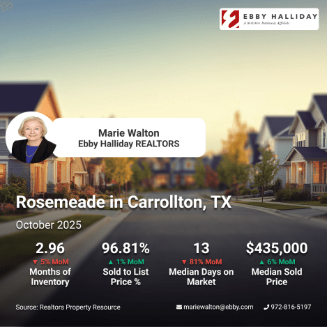 Considering the current market dynamics in Rosemeade, Carrollton, TX, Buyers and Sellers should plan carefully to optimize their opportunities. For expert advice and assistance, contact Marie Walton, REALTOR at mariewalton@ebby.com.