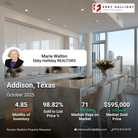 Navigating the Addison, Texas real estate market in October 2025, I’ve observed an intriguing dynamic for those buying and selling simultaneously. With a 4.85-month supply of inventory, the market is seeing a 5% decrease in inventory from last month, but a notable 16% increase over the past year, suggesting a tightening yet growing market. The median list price for new listings stands at $562,450, while the median active list price is slightly lower at $545,000, reflecting potential negotiation opportunities. Meanwhile, the pending listings, with a median price of $609,950 and 81 median days in RPR, indicate a competitive landscape as the median sold price jumps 23% MoM to $595,000. Addison Circle Park, a community highlight, offers a serene escape amidst these bustling market activities. For those balancing both buying and selling, timing is key, and the current market trends present unique opportunities for strategic moves. For a detailed Addison-level CMA, reach out to Marie Walton at Ebby Halliday REALTORS via mariewalton@ebby.com.