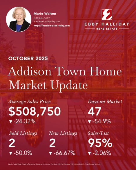Given the broader backdrop of elevated inventory across the DFW region and a cooling housing market, Addison’s town-home market in October can be characterized as stable and methodical, without the frenzied pace of prior years but maintaining enough activity to support both buyers and sellers.