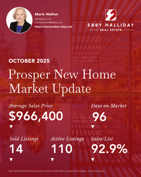 The single-family new construction market in Prosper this October continues to reflect the town’s strong appeal, with builders maintaining a confident pace and focusing on quality, lifestyle-driven designs, and thoughtful community planning. Buyers are seeing a mix of fresh inventory and curated upgrades as Prosper remains a top choice for those seeking space, convenience, and a polished suburban environment. With shifting buyer expectations and evolving builder incentives, navigating this landscape requires a strategic approach—one that ensures you’re not just choosing the right home, but securing the right terms, protections, and representation. That’s why having Marie Walton, Realtor at your side is essential. She understands builder processes, negotiates from experience, and safeguards your interests from contract to closing, giving you the advantage you need in a competitive and ever-changing new construction market.