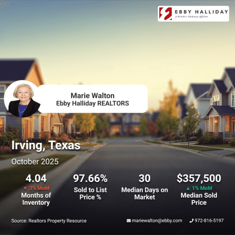 #IrvingTX #RealEstateIrving #HomesForSalesIrving #DFWRealEstate #NorthTexasHomes #RealEstateTrends #Realtor #RealEstateAgent #BuyerAgent #HouseHunting #HomeBuying #SellerAgent #ListingAgent #SellingMyHouse #IrvingRealEstate #DFWSellersWin #MarketOpportunity #HomeValueGrowth #MarieWaltonRealtor