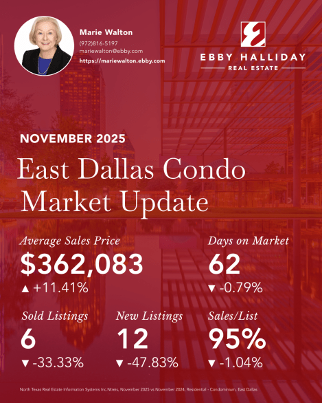 For sellers, the landscape required a more strategic approach. Properties that were priced correctly and presented well still moved efficiently, often within a few weeks, but overpricing could quickly push listings to linger. The strongest demand centered around condos with modern finishes, strong walkability, and access to amenities like parking, pet-friendly spaces, and outdoor living areas. As buyers became more discerning, staging, photography, and realistic pricing became key tools in securing offers. Overall, the East Dallas market in late 2025 favored balance—neither fully a buyer’s nor a seller’s market, but a period emphasizing smart preparation, patience, and value awareness on both sides of the transaction.