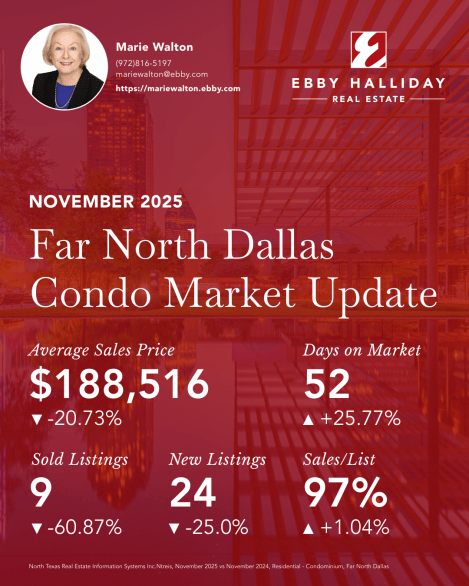 In November 2025, the condominium market in the far-north Dallas area entered a phase of greater balance between buyers and sellers, marking a shift away from the rapid-sale environment of prior years. Inventory has risen, giving buyers more options, longer decision windows, and increased negotiating leverage. Many condos are remaining on the market longer, which tempers urgency among buyers and reduces bidding wars — if a unit is priced and presented realistically, it still draws interest, but overpriced or poorly maintained units are seeing less demand.