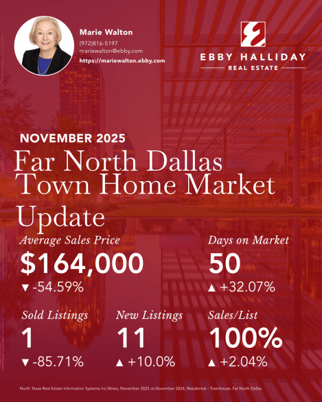 In November 2025, the town-home market in Far North Dallas exhibited signs of cooling and adjustment, moving toward a more balanced state than the frenetic pace seen during peak market years. Inventory has grown and sellers are beginning to show more flexibility, prompting longer marketing times and more realistic pricing strategies. Serious buyers remain active — especially those motivated by interest rates or life changes — though overall buyer demand appears more selective and measured than in prior periods. Town-homes that are well priced and properly presented continue to attract attention, while properties listed above market expectations are facing extended days on market or price reductions. As the market normalizes, the environment favors buyers who are patient and intentional, yet sellers who price appropriately and condition the property well are still finding success. Buyers were not in the market for town homes in November.