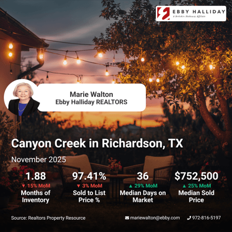 Navigating the real estate market in Canyon Creek, Richardson, TX, this November 2025, requires a keen eye on timing and trends. With a months supply of inventory at 1.88 and a 15% drop in inventory in just one month, sellers can sense the urgency, while buyers might feel the pinch. The area sees a median list price of $862,500 for new listings and a median sold price of $752,500, reflecting a significant 25% month-over-month increase. Meanwhile, active listings stand at $757,500 with 16 homes on the market, and pending sales are moving briskly with a median of 53 days in RPR. This data suggests a competitive environment where both buying and selling require strategic planning. While enjoying a stroll in Prairie Creek Park or exploring the local eats, consider how these market dynamics might impact your simultaneous buying and selling decisions. For a more tailored market analysis at the Canyon Creek level, reach out to Marie Walton, REALTOR at mariewalton@ebby.com.