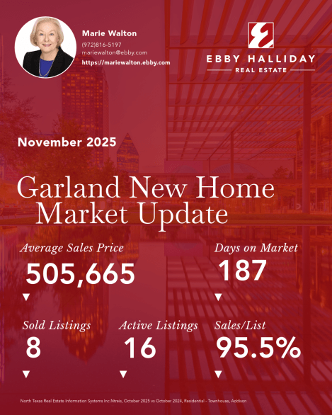 In November 2025, the new home sales market in Garland, Texas reflected a steady and measured pace, characterized by thoughtful buyer engagement and deliberate builder strategies rather than urgency-driven activity. Builders continued to emphasize quality construction, functional floor plans, and neighborhood amenities that appeal to long-term homeowners, while buyers approached decisions with a clear focus on value, location, and future livability. This environment favored informed guidance and careful negotiation, making experienced representation essential. Engaging Marie Walton as your REALTOR® ensures strategic advocacy grounded in deep local knowledge, disciplined market insight, and a client-first approach. Her ability to navigate builder contracts, align new construction opportunities with individual goals, and manage each stage of the transaction with professionalism and precision provides buyers with clarity, confidence, and protection throughout the process, resulting in a smoother and more successful new home purchase experience.