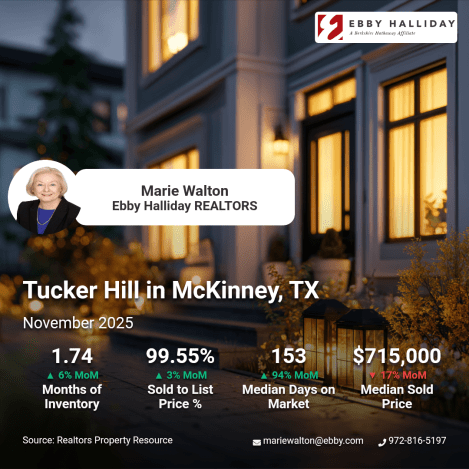 Navigating both buying and selling in Tucker Hill, McKinney, TX, as of November 2025, presents a unique opportunity. With a 1.74 months supply of inventory indicating a brisk market, there are currently four active listings at a median price of $992,500, alongside just one new listing and one pending. Notably, homes sold at a median price of $715,000, reflecting a 17% decrease from last month, while the median days on market surged by 94% to 153 days, hinting at a slower pace. As you consider these dynamics, take a stroll through the charming streets of Tucker Hill, perhaps stopping by the local community garden or enjoying the proximity to downtown McKinney. Balancing the timing of buying and selling requires strategic planning, and I’m here to assist. Reach out to Marie Walton at Ebby Halliday REALTORS via mariewalton@ebby.com for a Tucker Hill-level CMA and expert guidance through your real estate journey.