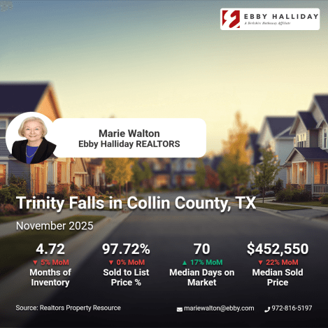 Navigating the Trinity Falls market in Collin County, TX this November 2025, presents unique opportunities for both buyers and sellers. With 4.72 months of inventory and a slight 5% increase over the past year, the market is showing signs of stabilization. New listings have a median price of $607,497, while active listings average at $579,875, making it essential to strategize timing as you aim to buy or sell. Although the median sold price has seen a 22% month-over-month decrease to $452,550, homes linger for 70 days on the market, up 17%. Nearby parks and trails offer a glimpse of Trinity Falls’ outdoor allure. Whether you’re eyeing new opportunities or planning your next move, contact Marie Walton, REALTOR via mariewalton@ebby.com for a Trinity Falls-level CMA.